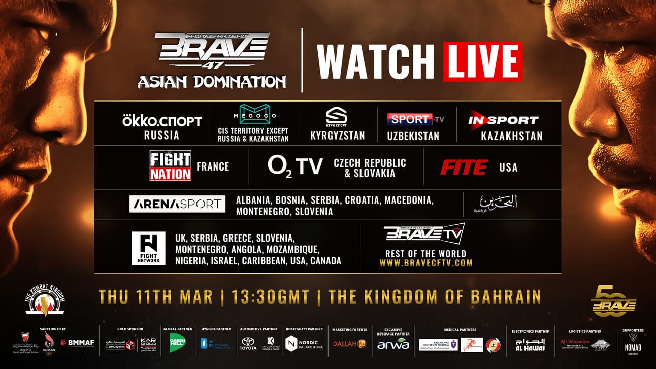 BRAVE® CF 47 will be broadcasted across the globe from Arad Fort, Bahrain today starting at 4:30 PM (GMT+3). Fans around the world can register on BRAVE® CF TV for free to watch the live stream of the event. In Bahrain, you have the option of also watching BRAVE® CF 47 on Bahrain TV Sports. As for Russia, the fight will be broadcasted on ökka.cnopt while FITE TV broadcasts it in the United States. In Central Asia, KTPK Cnopt will broadcast it in Kyrgyzstan, Sport.TV in Uzbekistan, and IN SPORT in Kazakhstan. O2TV Network will also have the fights available for Czech Republic and Slovakia, while Fight Network will broadcast the show to the UK, Serbia, Greece, Slovenia, Montenegro, Angola, Mozambique, Israel, Nigeria, Caribbean, USA, Canada. Arena Sport will make the fight available for fans in Albania, Bosnia, Serbia, Croatia, Macedonia, Montenegro, and Slovenia. As for France, fans can watch the fights on Fight Nation. Megogo will also be broadcasting to CIS Territories except for Russia and Kazakhstan.