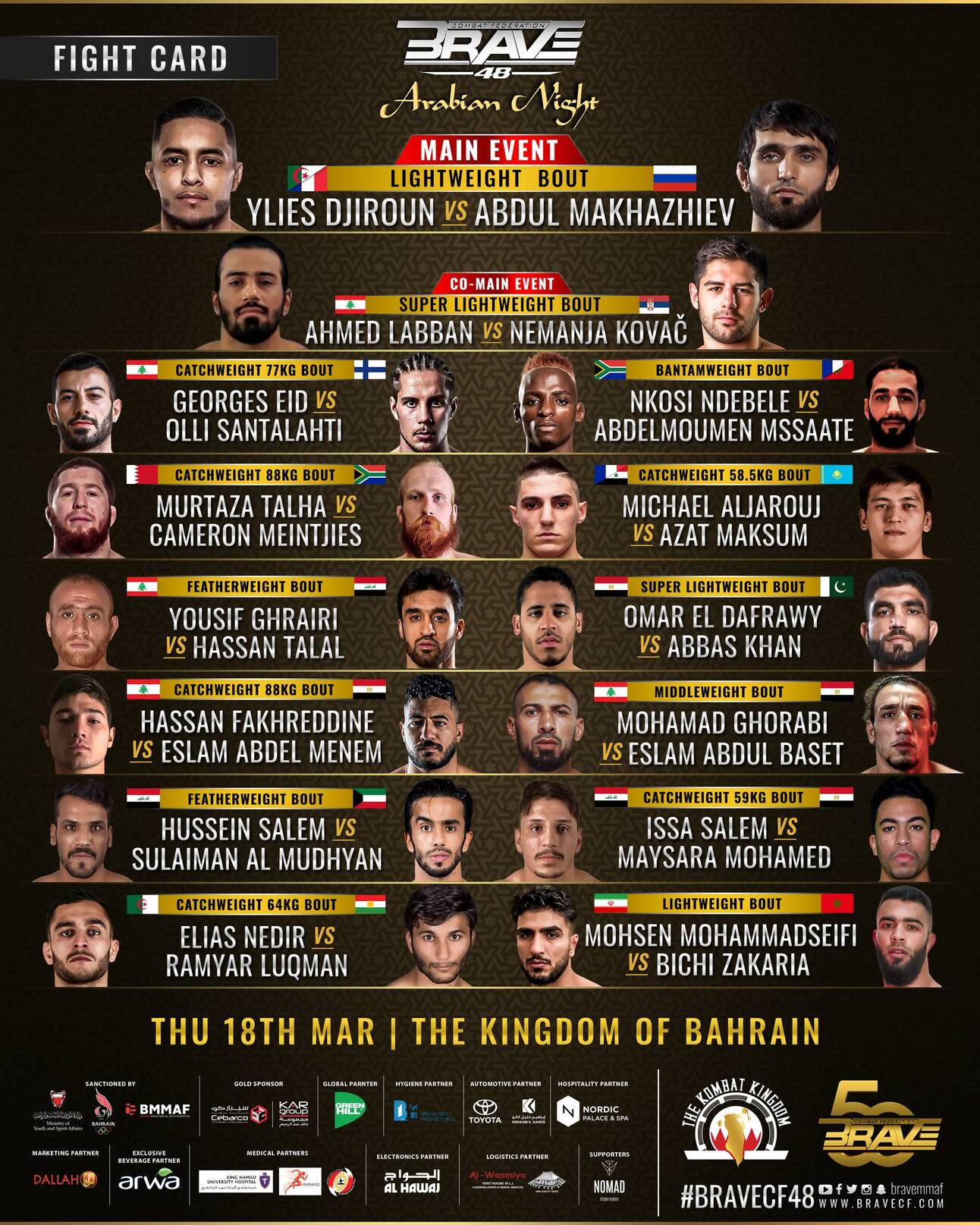 BRAVE® Combat Federation, the premier Mixed Martial Arts promotion founded by His Highness Sheikh Khaled bin Hamad Al Khalifa and based in the Kingdom of Bahrain, has announced the full fight card for next week’s edition, BRAVE® CF 48: Arabian Nights, which takes place at the Arad Fort, on March 18th.The event, which will be the second of four scheduled fight nights in Kombat Kingdom, will serve as a global platform for Arab MMA talent to audiences worldwide, from the biggest sports property in the Middle East.BRAVE® CF 48 will be headlined by a Lightweight showdown between French-Algerian powerhouse Yiles Djiroun, making his much-anticipated promotional debut, and Russia’s Abdul-Rakhman Makhazhiev. The co-main event of the evening will see the much-anticipated debut of Lebanese star Ahmed ‘’Shadow’’ Labban, as he takes on Serbia’s Nemanja Kovac. Another huge name in Lebanese MMA, Georges Eid, will compete against Olli Santalahti in a Catchweight of 77 kg. Bahrain’s Murtaza Talha returns to action against Cameron Meintjies while Mohammad Ghorabi takes on Eslam Abdul Baset at Middleweight. The younger brother of BRAVE® Combat Federation Middleweight World Champion Mohammed Fakhreddine, Hassan Fakhreddine will return to BRAVE® CF, taking on Eslam Mostafa Abdel Menem. BRAVE® CF 48 fight card Lightweight: Ylies Djiroun vs Abdul-Rakhman MakhazhievSuper Lightweight: Ahmed Labban VS Nemanja KovacCatchweight 77 kg: Georges Eid VS Olli SantalahtiBantamweight: Nkosi Ndebele VS Abdelmoumen MssaateCatchweight 88 kg: Murtaza Talha Ali VS Cameron MeintjiesCatchweight 58.5 kg: Michael Aljarouj VS Azat Maksum Featherweight: Yousif Ghrairi VS Hassan TalalSuper Lightweight: Omar El Dafrawy VS Abbas KhanCatchweight 88 kg: Hassan Fakhreddine VS Eslam Mostafa Abdel MenemMiddleweight: Mohamad Ghorabi VS Eslam Abdul BasetFeatherweight: Hussein Salem VS Sulaiman Al ModhyanCatchweight 59 kg: Issa Salem VS Maysara MohamedCatchweight 64 kg: Elias Nedir VS Ramyar LuqmanLightweight: Mohsen Mohammadseifi VS Bichi Zakaria