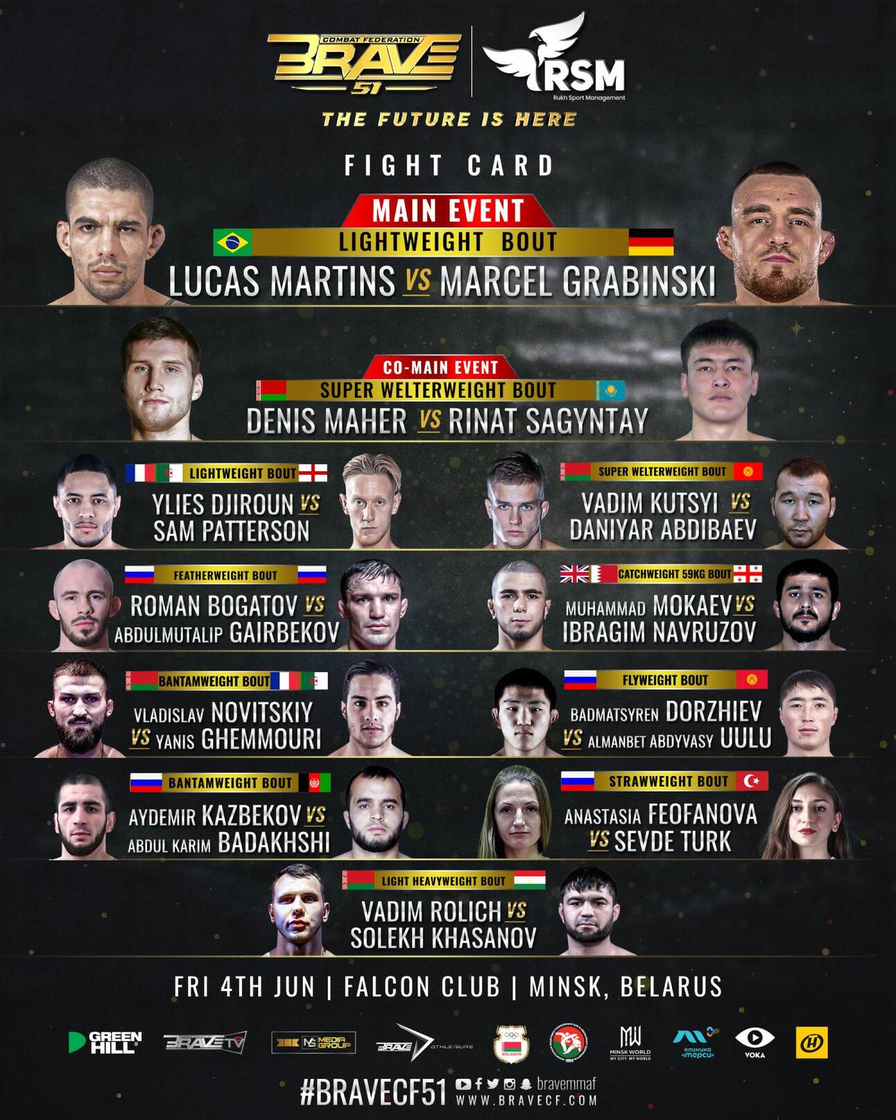 BRAVE® CF 51: The Future Is Here will have the following nations represented: Brazil, Germany, Belarus, Kazakhstan, France, Algeria, England, Kyrgyzstan, Russia, Bahrain, Georgia, Afghanistan, Turkey, Tajikistan, and takes place June 4th, at the Falcon Club, in Minsk, Belarus, in association with Rukh Sport Management.