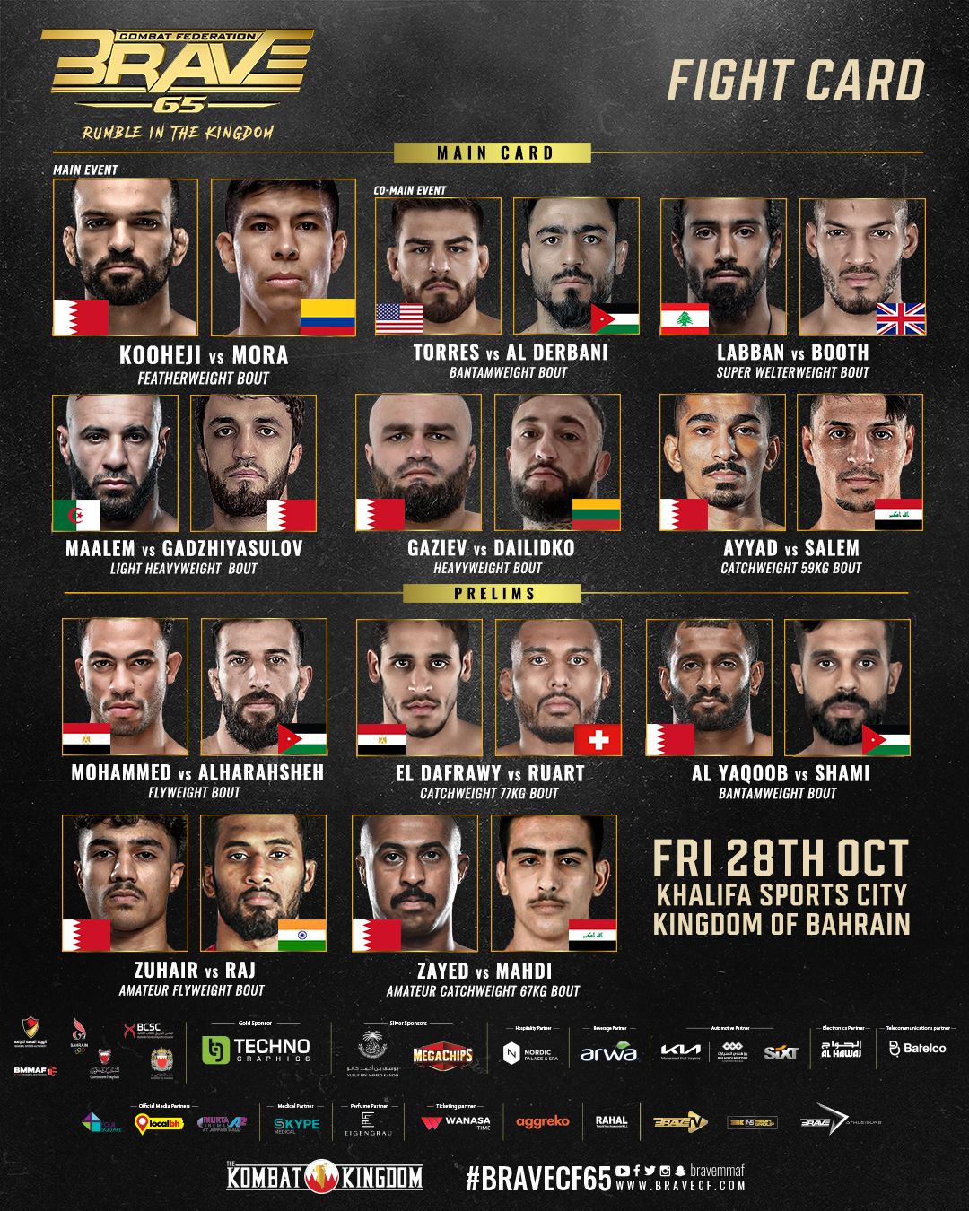 The third and final event of the latest installment of Kombat Kingdom. Set for October 28th at the Khalifa Sports City Arena, the event will be headlined by Bahraini hero Hamza Kooheji going up in weight to face Colombia’s Eduardo Mora. The fight will be contested at Featherweight as Kooheji looks to get back to the win column following a failed title shot at 135 pounds. In the co-main event of the evening a huge Bantamweight bout takes place as Arab superstar Izzedine Al-Derbani drops down to 135 to take on Jose Torres, the number five Flyweight in the world, officially making his return to Bantamweight.