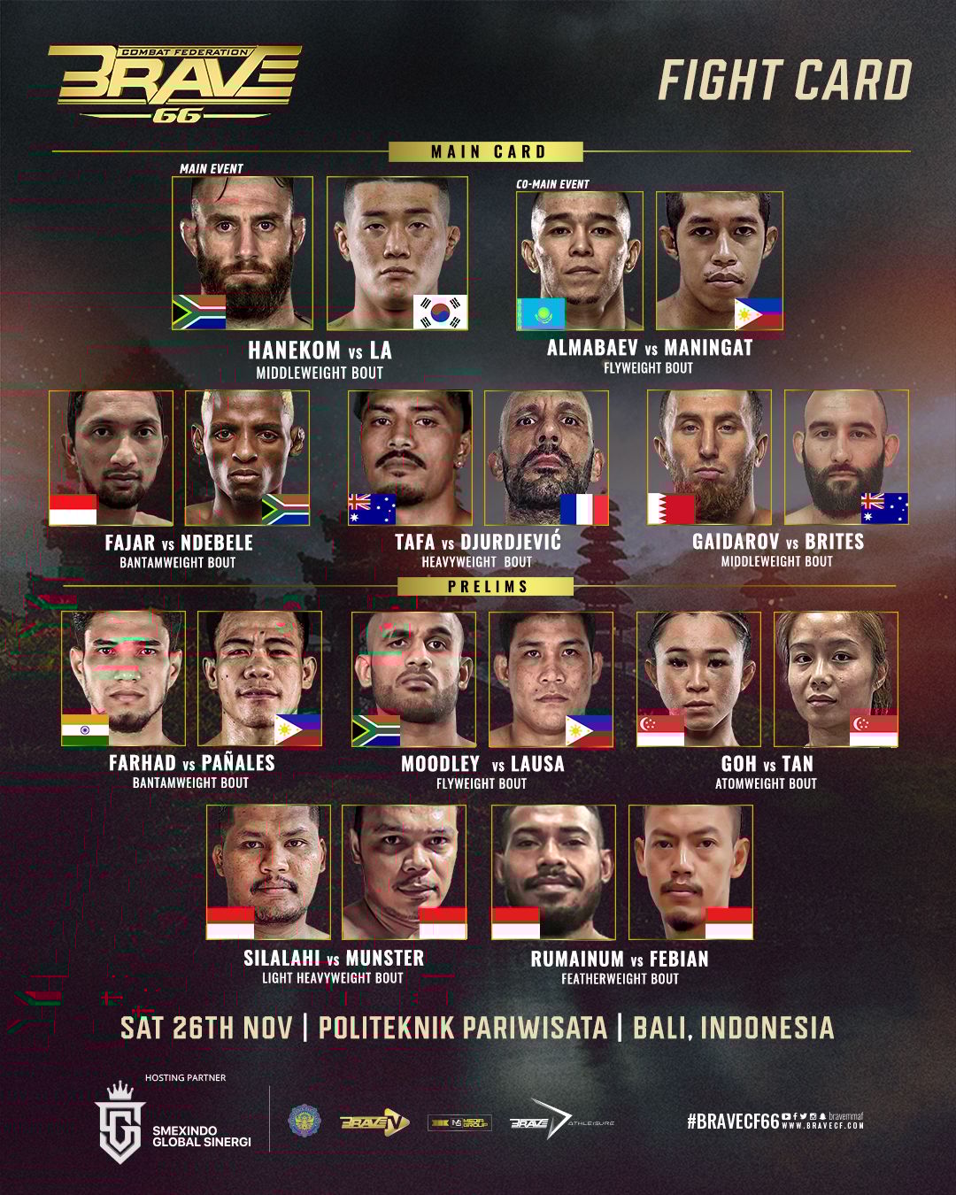 The event will feature athletes from four continents (Asia, Europe, Africa, and Australia) and eight regions (Western Europe, Africa/Middle East, Central Asia, Far East Asia, South-East Asia, Subcontinent, and Oceania). The BRAVE CF 66 main event sees number-two ranked BRAVE CF Middleweight, South Africa's Chad Hanekom take on South Korea's In Jae La in a hot 185-pound fight. One of BRAVE CF’s top 125-pounders, Kazakhstan’s Asu Almabaev will face BRAVE CF debutant, the Philippines' Kenneth Maningat in the co-main event of the evening.