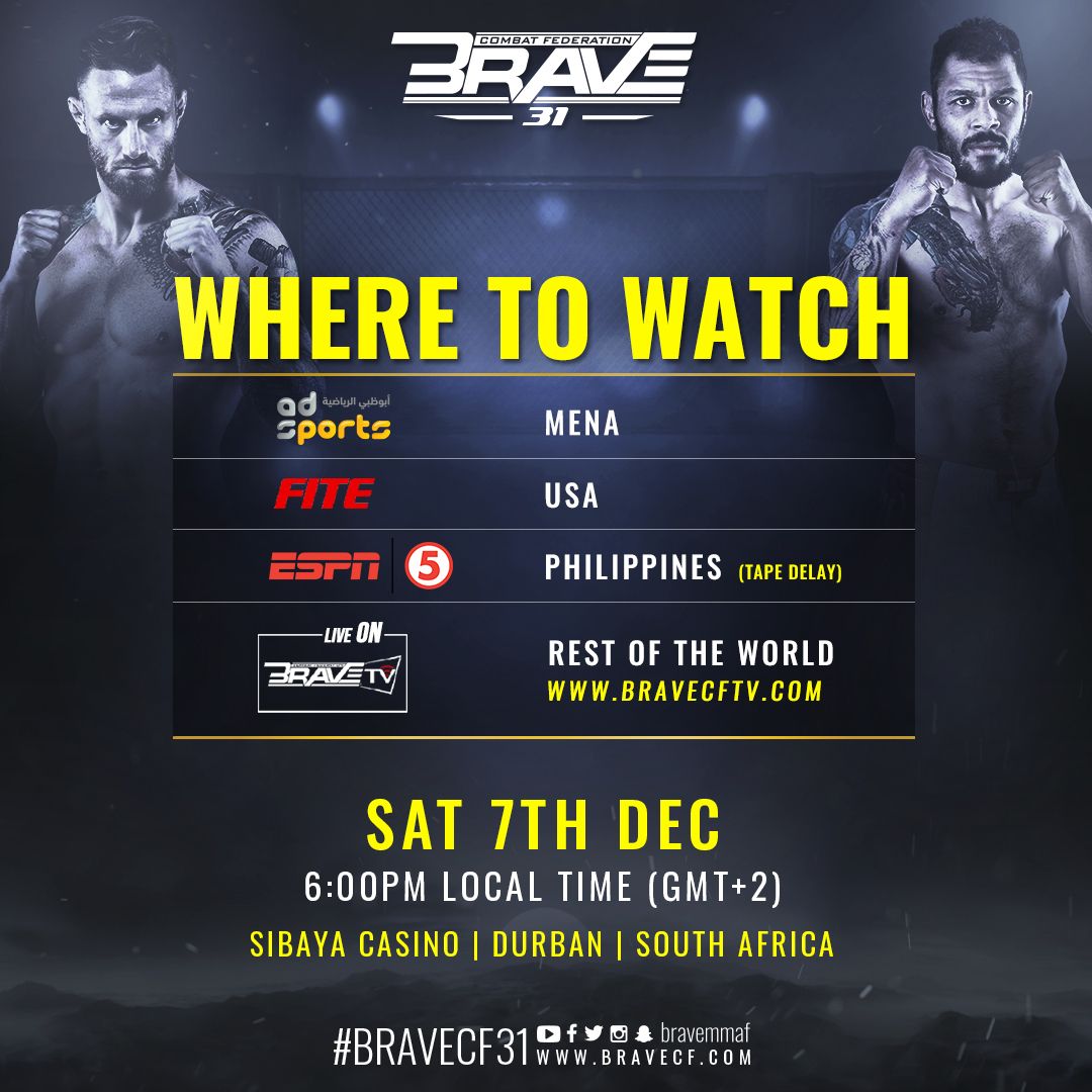 BRAVE Nation fans can watch BRAVE CF 31 around the world live and free by subscribing to BRAVE CF TV . Fans from the United States will be able to watch through FITE TV, while Filipino fans can watch the show on tape delay via ESPN5, and fans in the Middle East and North Africa can tune in to Abu Dhabi Sports.