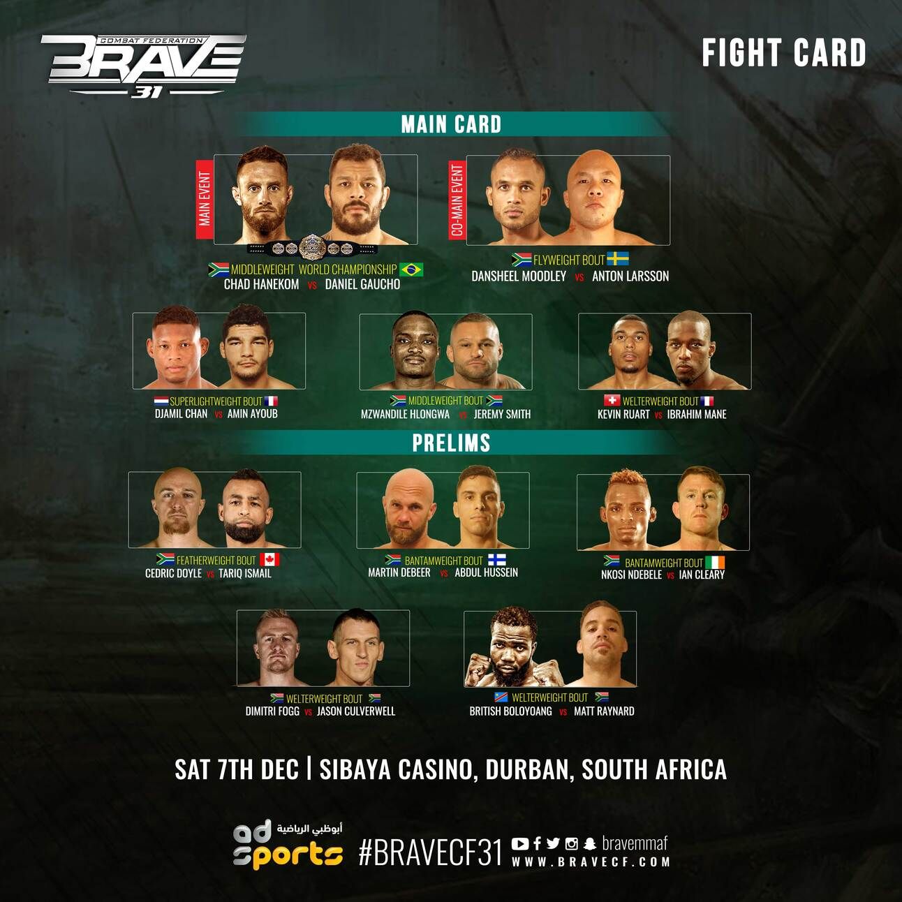 BRAVE Combat Federation returns to South Africa, this Saturday, December 7th, in Durban, for an explosive fight card that will leave fans around the world on the edge of their seats. In the main event of the evening, the inaugural Middleweight world title will be on the line as local hero Chad "Superman" Hanekom takes on Daniel "Gaucho" Souza Pereira for the belt.